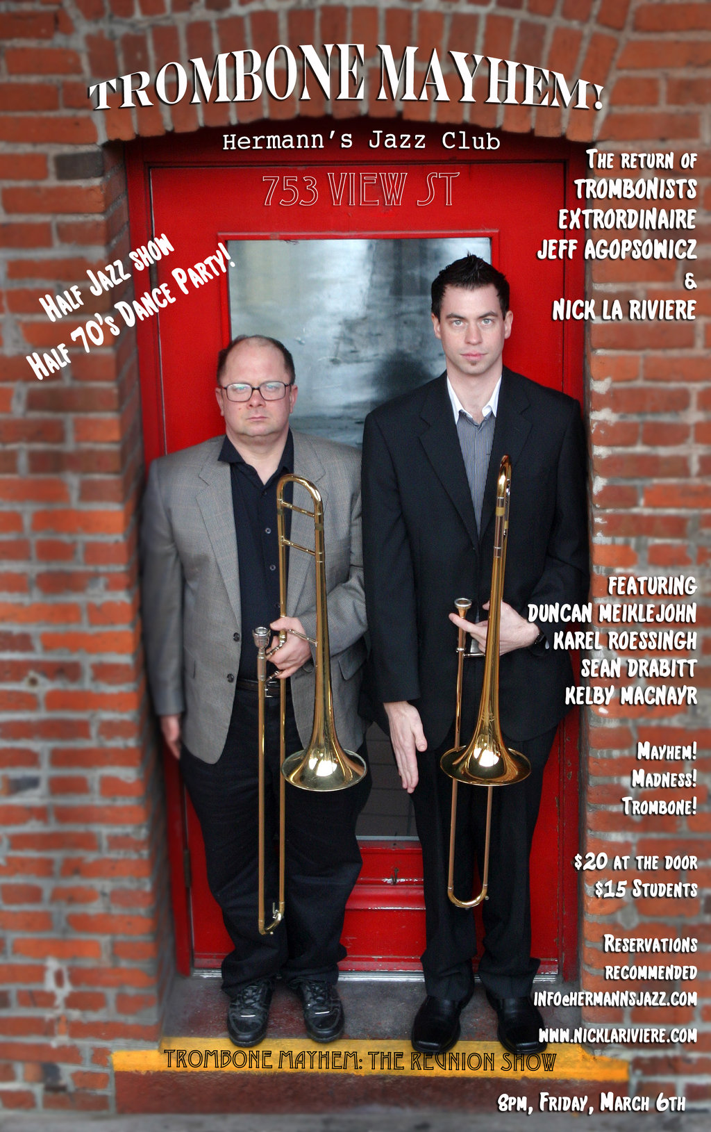 Join Nick La Riviere and Jeff Agopsowicz with the return of their fantastic and wild band, Trombone Mayhem! Joining them are Karel Roessingh, Sean Drabitt, and Kelby MacNayr.