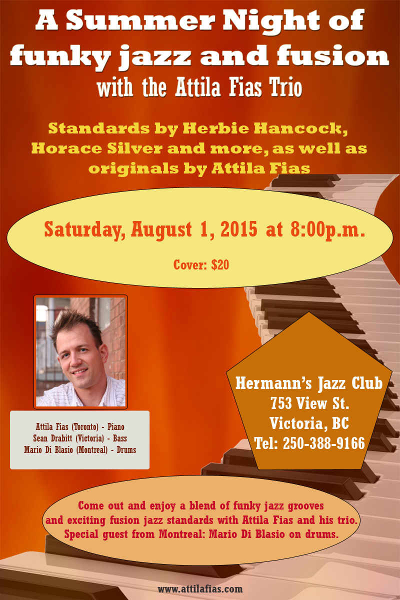 8:00pm - 10:30pm doors at 7:30pmCome out and enjoy a blend of funky jazz grooves and exciting fusion jazz standards as well as originals with award winning pianist, composer and recording artist Attila Fias from Toronto.