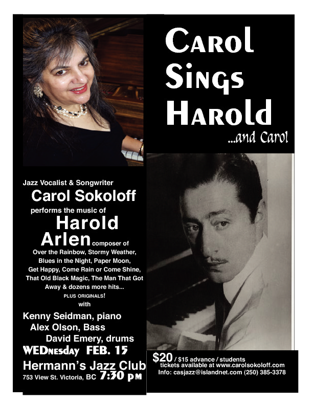 the Music of Harold Arlen performed by jazz vocalist and songwriter Carol Sokoloff, plus originals in his style.