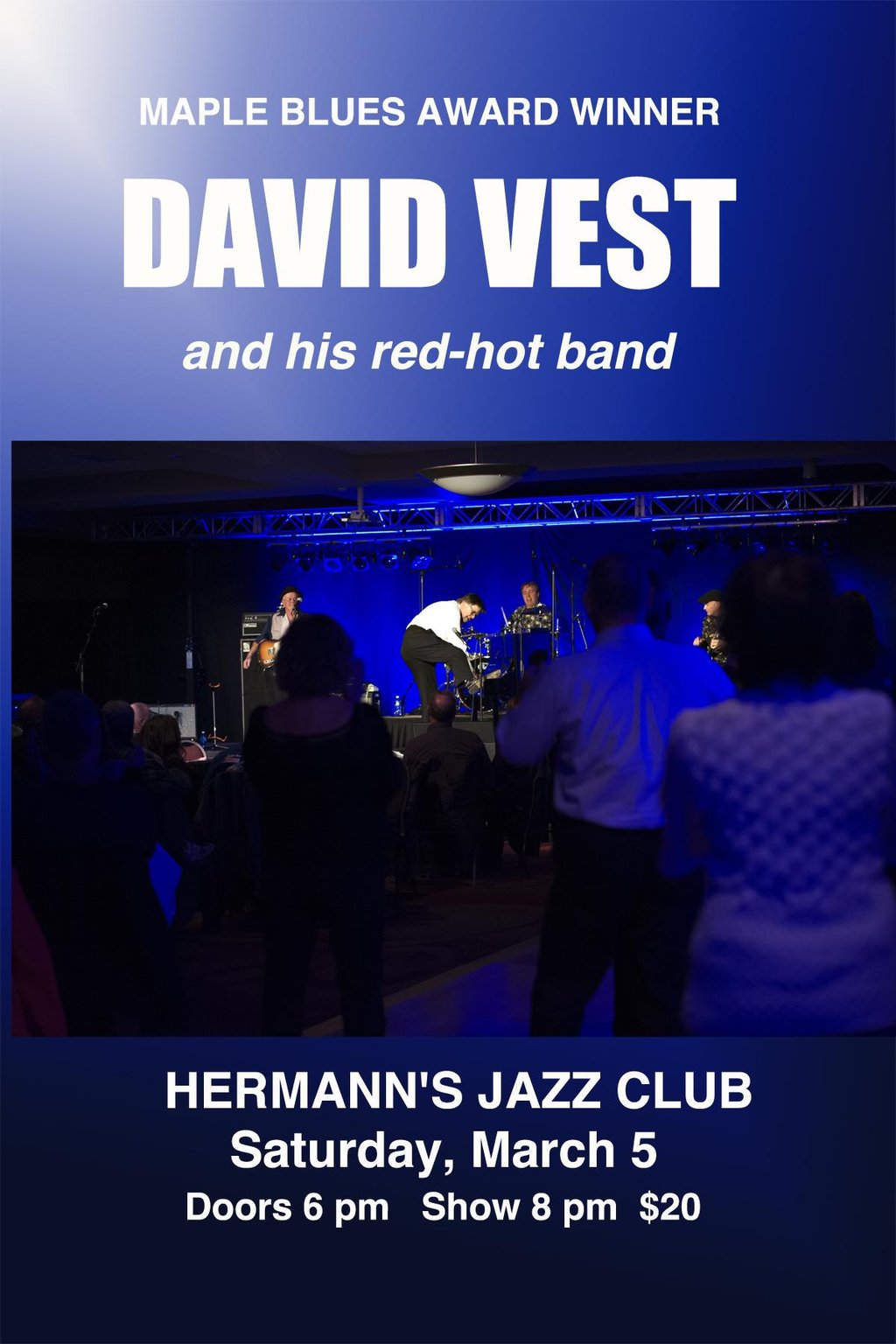 They call him a bluesman, but he can play jazz piano all night long, and he rocks as hard as anybody out there. Three time Maples Blues Award winner David Vest brings the complete package, with Damian Graham anchoring the band.