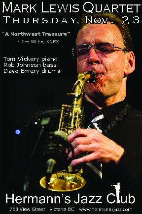 8pm doors at 6pmBack by popular demand! Seattle area saxophone and flute virtuoso Mark Lewis returns to Hermann’s with his brilliant Victoria quartet. Mark has been a part of jazz scenes from Seattle and San Francisco to Rotterdam and Paris. His new album, The New York Session, features piano legend George Cables, veteran bassist Essiet Essiet and drummer Victor Lewis. Author of 1,700 original compositions and master of countless jazz standards, each show is unique and fantastic! Info, reviews, videos and more at http://MarkLewisMusic.com/press_kit
