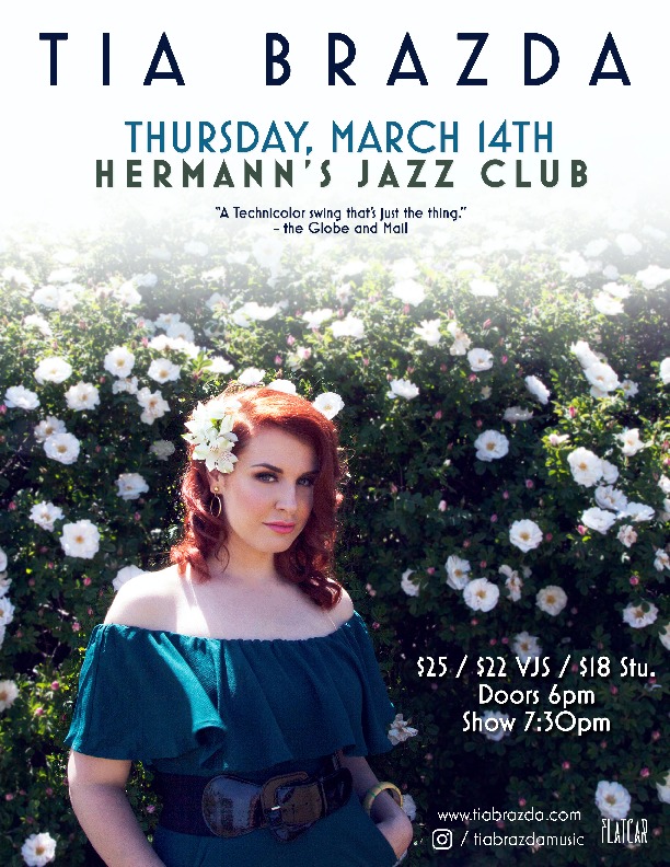 7:30pm - 10:30pm doors at 6:00pmJazz-pop songstress TIA BRAZDA returns to Hermann’s Jazz Club in Victoria on Thursday, March 14th as part of her spring BC tour. She brings with her a fresh collection of songs from her new album DAYDREAM, which debuted at #1 on the iTunes jazz chart in Canada upon its release. Brazda's jazz-pop gems and bold style have established her as a sparkling presence on the jazz scene at home and abroad, paying homage to the golden era while adding a modern twist. She has toured the world performing at such festivals as the Montreux Jazz Festival and Festival International de Jazz de Montreal (main stage) and recently toured coast to coast across North America in support of her new album.