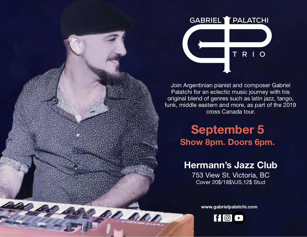 7:30pm - 10:30pm doors at 5:30pmJoin Argentinian pianist and composer Gabriel Palatchi, for an eclectic musical journey with his original blend of cultures such as latin jazz, tango, funk, middle east and more, as part of his cross Canada Tour!