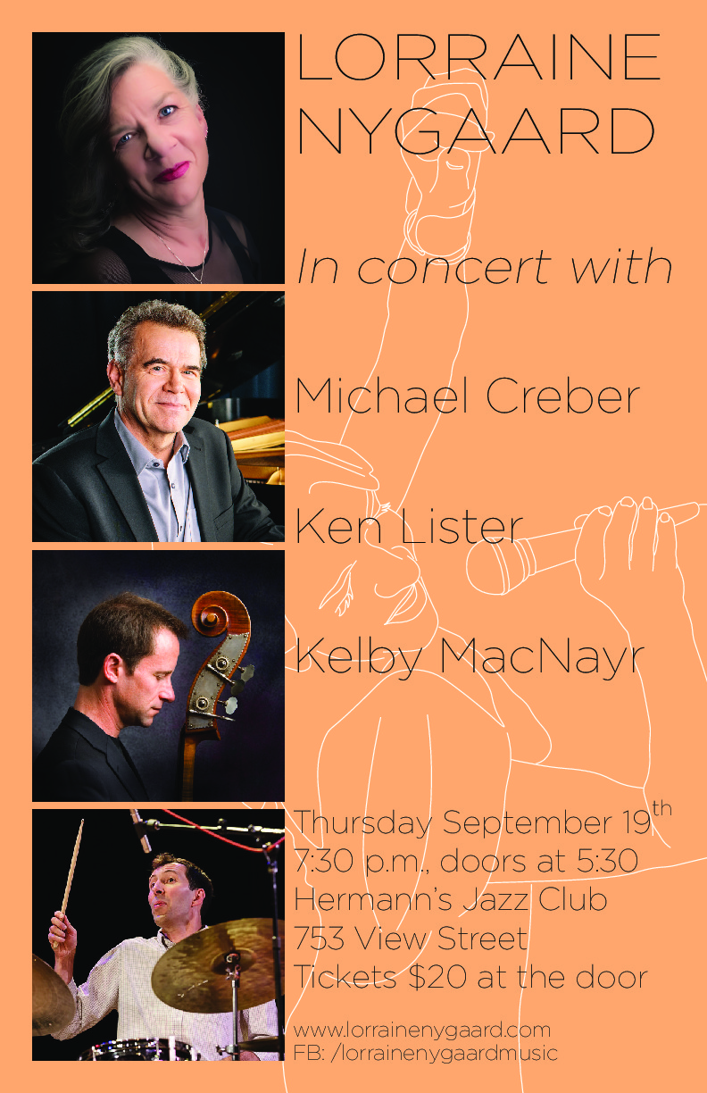Local songstress Lorraine Nygaard is thrilled to bring together for the first time at Hermann’s: Mr. Michael Creber on piano, Ken Lister on bass, and Kelby MacNayr on drums.