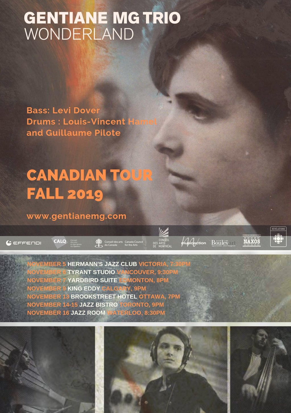 8:00pm - 10:30pm doors at 7:30pmPianist Gentiane MG was named Révélation Jazz Radio-Canada in 2018-2019. Gentiane MG Trio’s first album of original music, entitled Eternal Cycle, was classified among the 10 best jazz recordings of 2017 in Canada by CBC Music. The band just released their second album, Wonderland, and will be touring across Canada in November (Victoria, Vancouver, Edmonton, Calgary, Ottawa, Toronto, Waterloo).