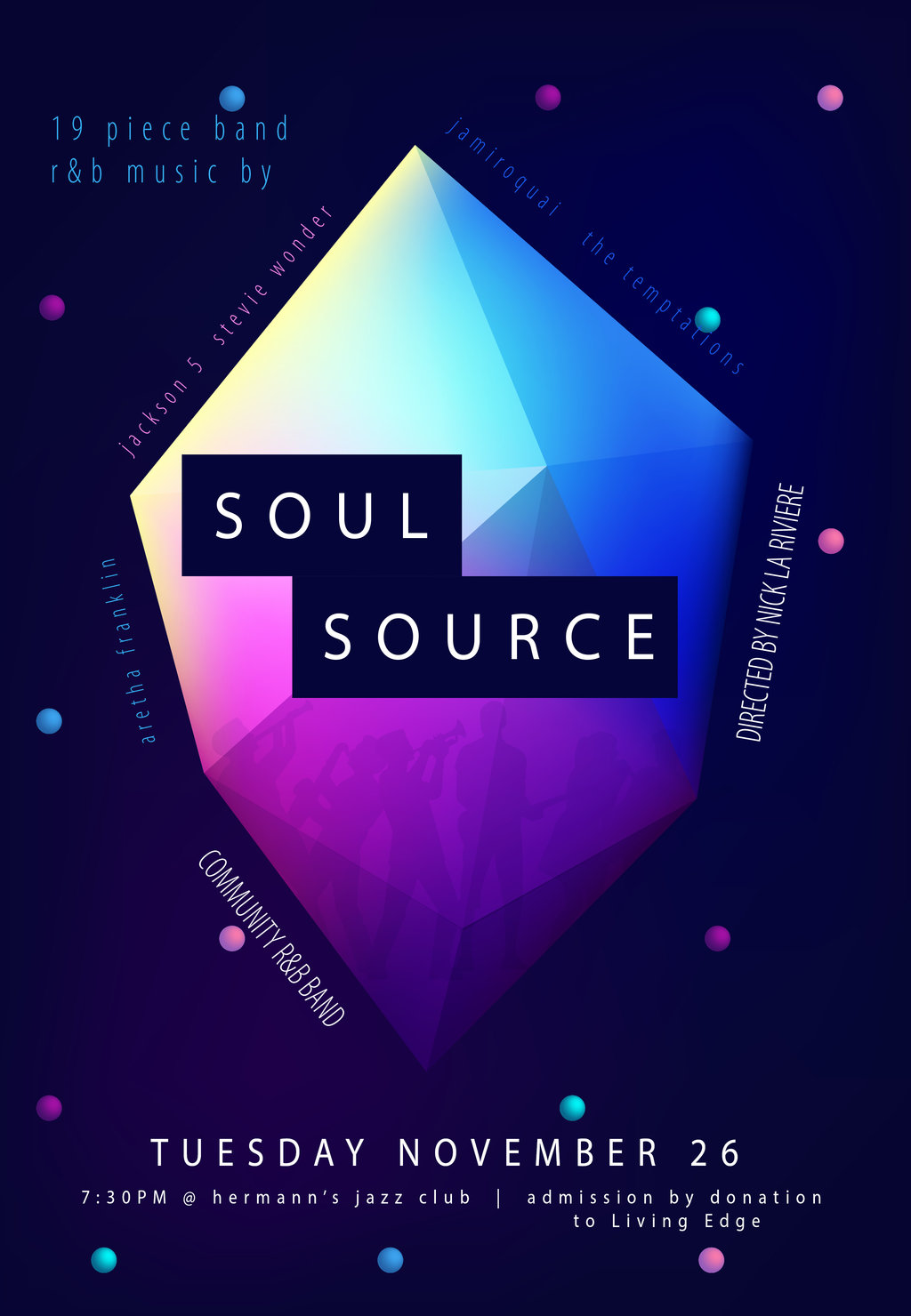 7:30pm - 10:30pm doors at 5:30pmSoul Source is a 20 piece R&B band directed by Nick La Riviere. Playing everything from Marvin Gaye to Bruno Mars to Aretha Franklin. It’s a lot of fun, and the show is put on for a good cause, fundraising for The Living Edge, which distributes free groceries in the Quadra Village neighbourhood. So come out and enjoy some great music while doing something positive for the community!