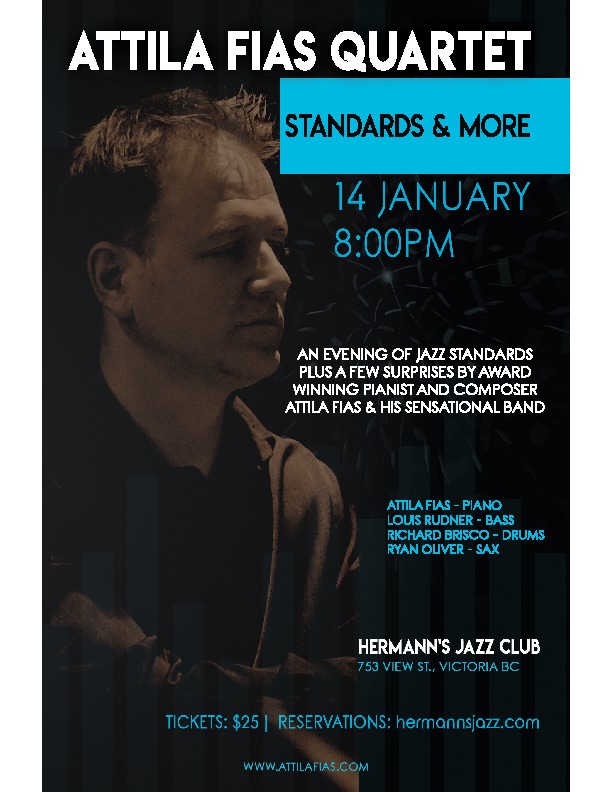 8:00pm - 10:30pm doors at 7:30pmToronto/Victoria based award winning jazz pianist and composer Attila Fias is back at Hermann’s for what is sure to be an exhilarating and intriguing evening of jazz! He will be leading his quartet of phenomenal musicians.