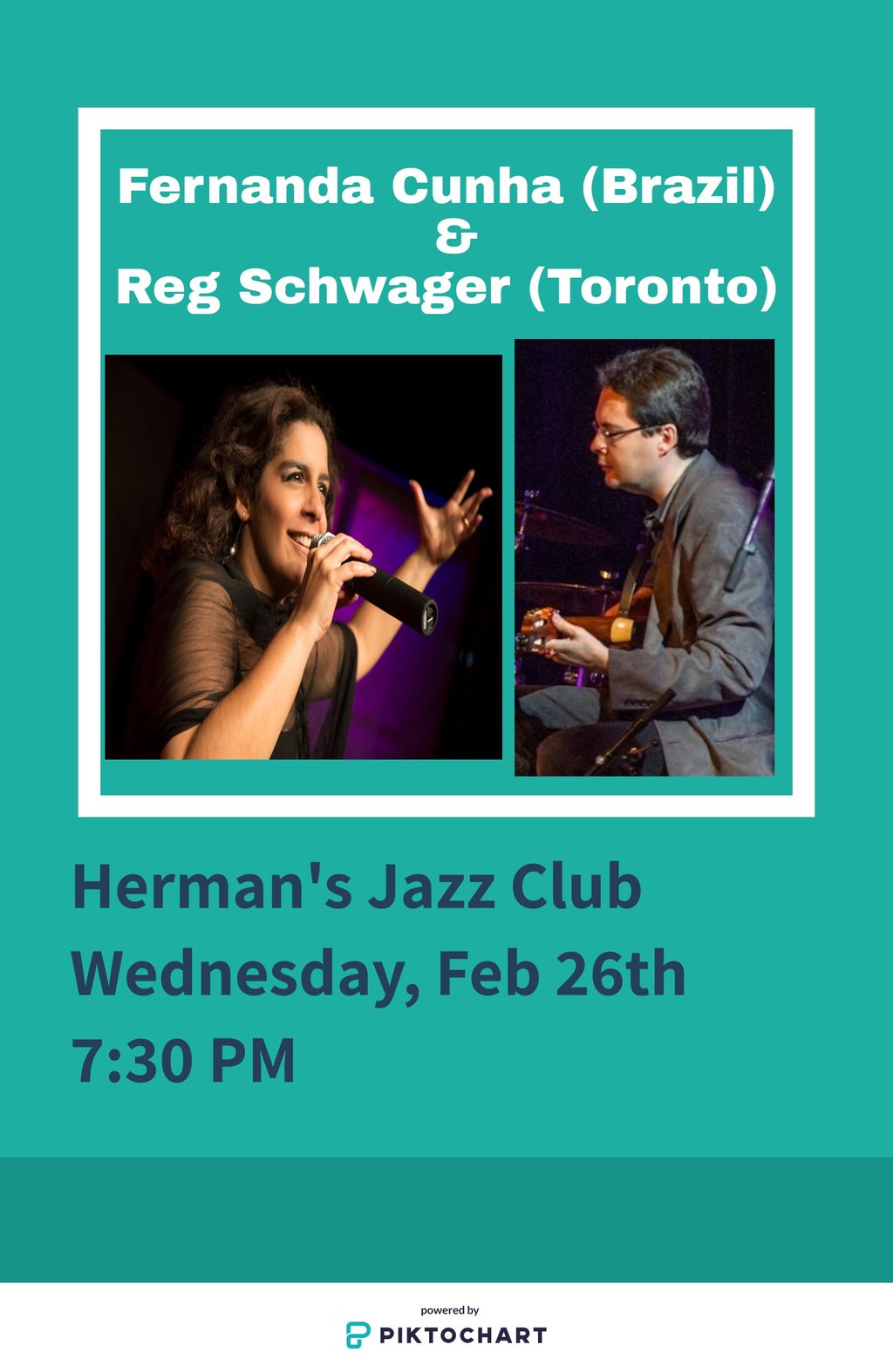 7:30pm - 10:30pm doors at 5:30pmFERNANDA CUNHA is an incredible Brazilian artist touring Canada with the living Canadian legend REG SCHWAGER! This evenings music wlll be intimate and warm, lyrical and mesmerizing all in one! These two incredible musicians are rarely on the west coast of Canada, so, catch them while they are here!