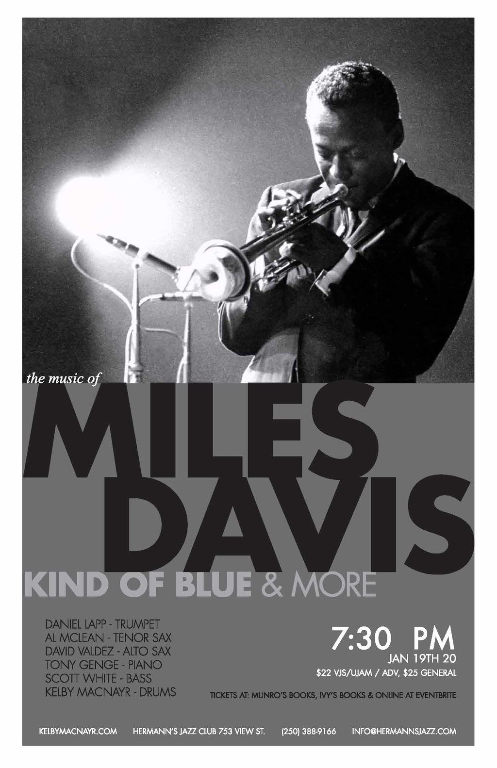 7:30pm - 10:30pm doors at 5:30pmDrummer, band-leader Kelby MacNayr brings together an ALL-STAR sextet to celebrate the music of jazz legend Miles Davis, performing the music from the iconic Kind of Blue recorded in March/April of 1959 and more. Often cited as the best-selling jazz album of all-time, this album marked a departure from the past, heralding in a new sound and style into mainstream jazz, and one of the finest performances in jazz history.