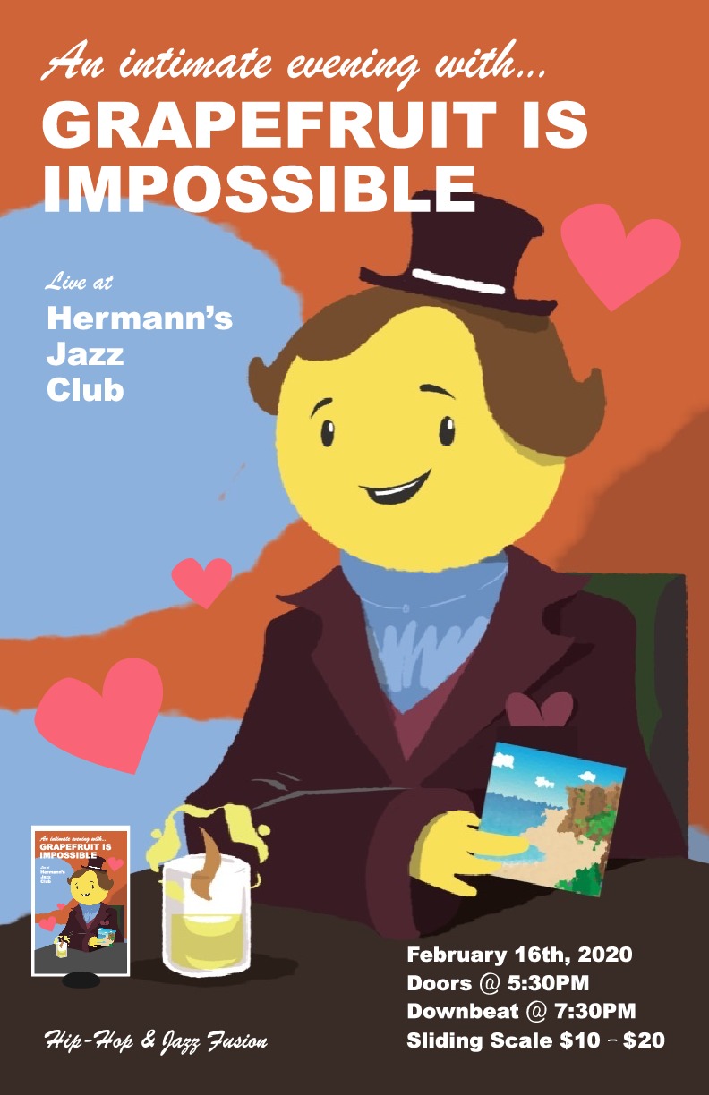 7:30pm - 10:30pm doors at 5:30pmGrapefruit Is Impossible's music is a creative fusion of jazz and hip-hop, as well as funk, and soul. They are a very interactive, engaging band, who's main focus is to create an atmosphere of inclusivity, positivity, and fun, all while delivering tight instrumentation, and smooth raps.