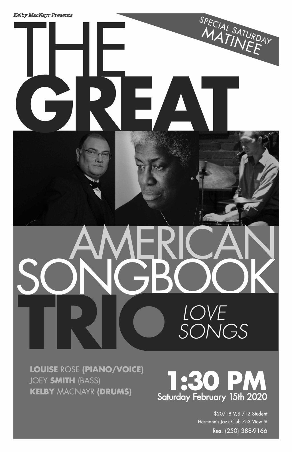 1:30pm - 3:30pm doors at 12:30pmContinuing the theme of Valentine's Day, Louise Rose and band will be tributing to romantic songs from back in the day! Bringing together three of the top names in West Coast jazz - Louise Rose, Joey Smith & Kelby MacNayr - three lovers of song, swing and the magic of music.