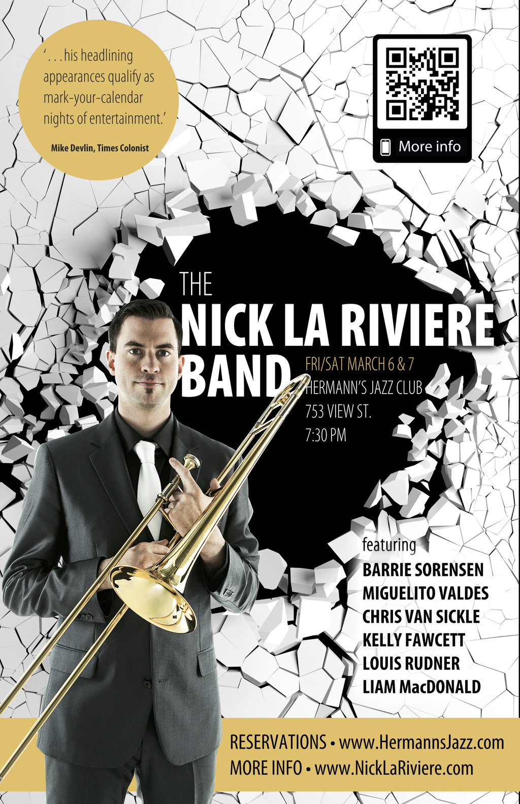Singer-songwriter Nick La Riviere is an accomplished trombonist who has toured with bands such as the Juno award winning Paperboys, Michael Kaeshammer, 54-40, and Adonis Puentes. He’s been a special guest with such bands as Steven Page (Barenaked Ladies) and The Temptations. As a freelancer, he’s one of Victoria’s busiest musicians.