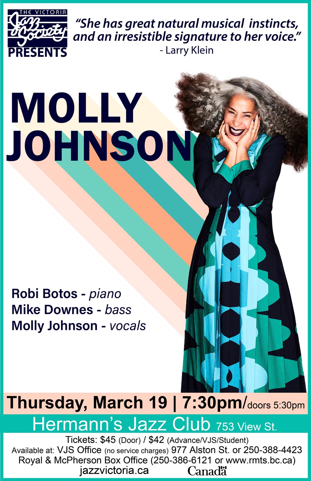 7:30pm - 10:00pm doors at 5:30pmThe Victoria Jazz Society regretfully announces that the Molly Johnson’s sold out performance at Hermann’s Jazz Club on Thursday, March 19 has been cancelled. The VJS was informed on March 11 by Molly Johnson’s management of the cancellation.