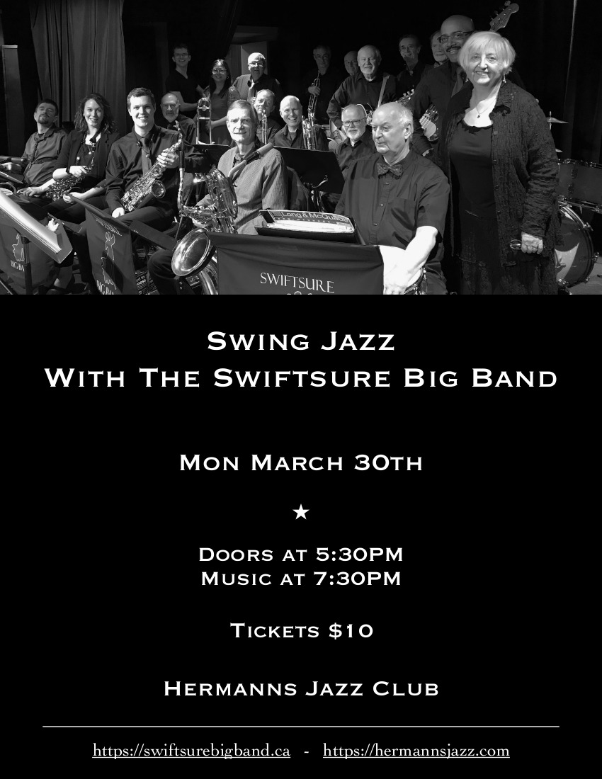 7:30pm - 10:30pm doors at 5:30pmThe Swiftsure 19 piece Big Band is pleased to be invited to perform at Hermanns’ Jazz Club on Monday, March 30th .