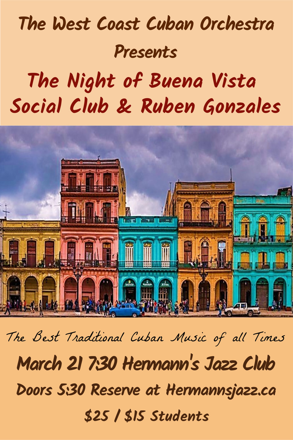 Pablo Cardenas & The West Coast Cuban Orchestra plays a tribute to the legendary Buena Vista Social Club & Ruben Gonzales at Hermann's Jazz Club. Even novices to the Cuban scene will be familiar with many of these timeless and evocative songs from a repertoire that represents the best traditional Cuban music of all times and the roots of Cuban Jazz. Music by Ignacio Pineiro, Rafael Lopez, Arsenio Rodríguez, Cesar Portillo, Compay Segundo, Ernesto Duarte, Faustino Oramas el guayabero, Nico saquito and much more. $25/$15 students, doors 5:30, show 7:30. Recommended to reserve at hermannsjazz.ca to secure a spot.