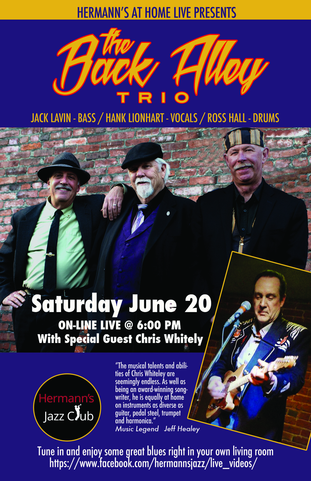 6:00pm - 7:00pm The Back Alley Trio are Victoria’s newest Blues band featuring bandleader Big Hank Lionhart, who is a commanding performer with his huge whiskey voice and larger than life stage presence. His hand-picked band of ace session men deliver the goods: great Blues music from the golden age of that idiom. Together with their very special guest Chris Whitely, one of Toronto’s greatest roots musicians, this will be a show not to be missed! Chris is an amazing multi-instrumentalist, and will be displaying his virtuosity on guitar, harmonica and trumpet. With Powder Blues founding member Jack Lavin on bass and veteran drummer Ross Hall this live streamed show will bounce you off your couch and onto whatever it is you use as your home dance floor! Grab your partner or a broom and dance your evening away with the Back Alley Trio + 1.