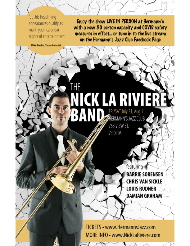 The Nick La Riviere Band will perform LIVE and IN PERSON at Hermann’s on July 31 and August 1, with some changes made to follow new COVID safety guidelines. Among those changes are a 50 person capacity for the audience, and 5 musician limit on stage. The band will also play one longer set rather than two shorter sets. Tickets are now also available online at http://www.hermannsjazz.ca, which we’re very excited about. This new ticketing system should make things easier for the audience and the band.