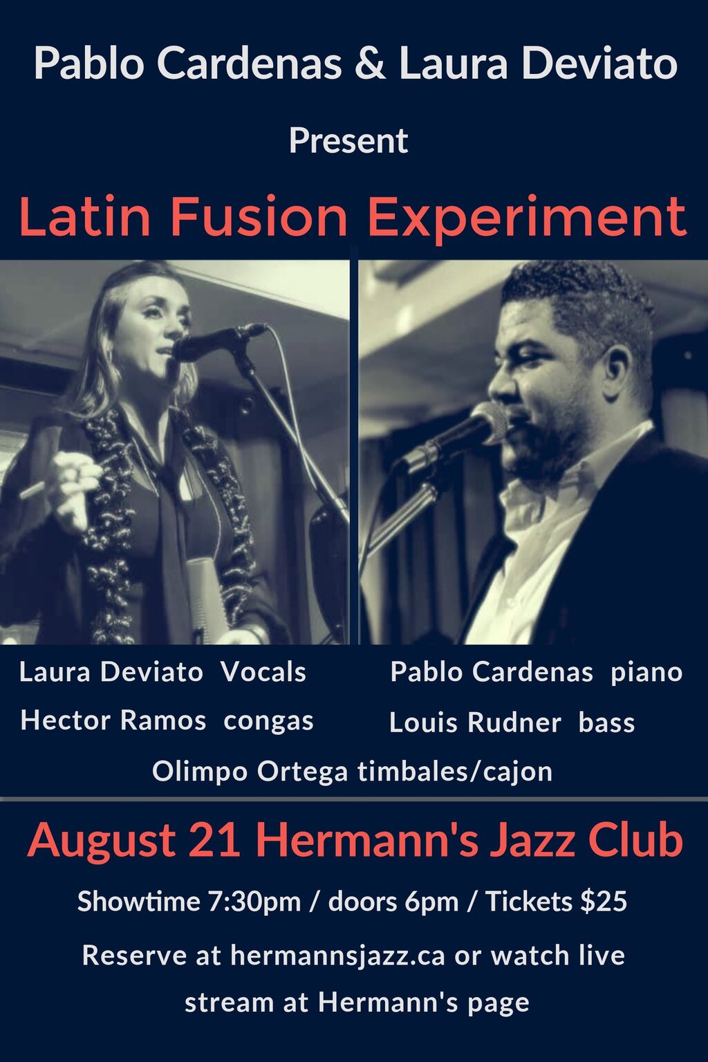 Pablo Cardenas brings to Hermann’s Jazz Club a selection of music that shows the variety of Latin and Cuban music, and how it blends with other genres, featuring Laura Deviato on vocals, Hector Ramos on congas, Olimpo Ortega on Timbales/Cajon, and Louis Rudner on bass.
