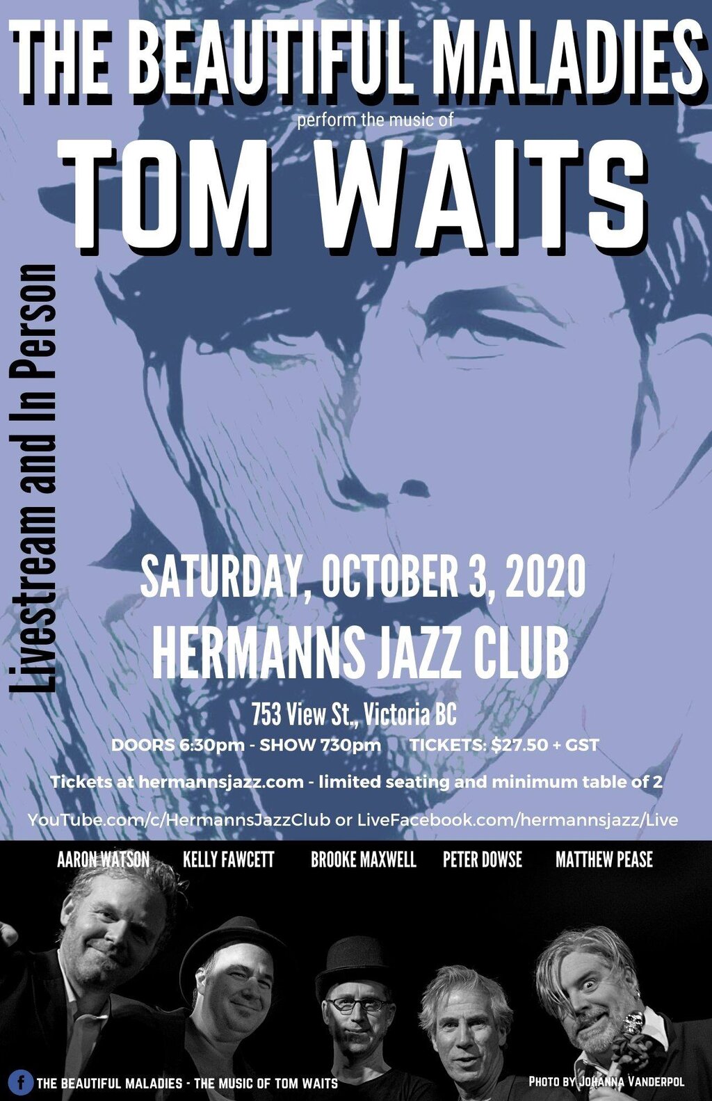 The Beautiful Maladies play the music of Tom Waits on October 3rd at Hermann's Jazz Club, with limited seating for a live audience, while also offering a live-streamed show for those unable to attend