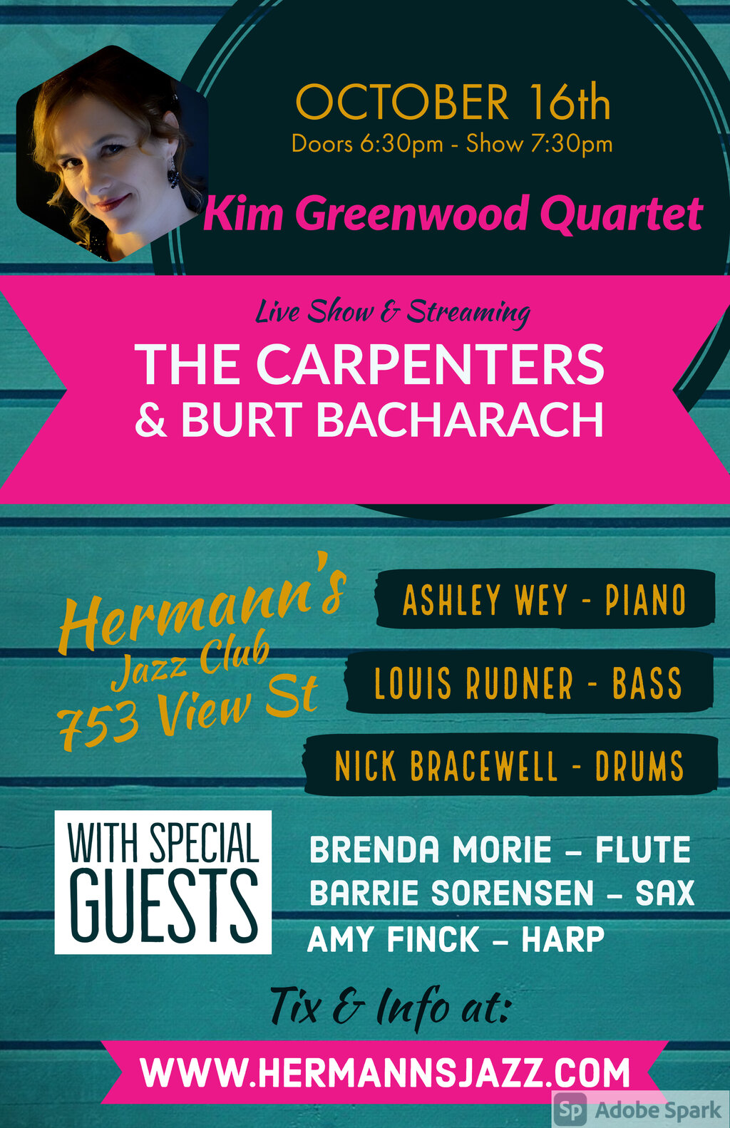 Chanteuse Kim Greenwood is back with her quartet performing some of the greatest hits form The Carpenters and Burt Bacharach! Karen Carpenter & Burt Bacharach were huge influences on Kim and she is so very excited to be performing live many of their amazing tunes backed by her stellar band Ashley Wey on keys, Louis Rudner on bass and Nick Bracewell on drums.