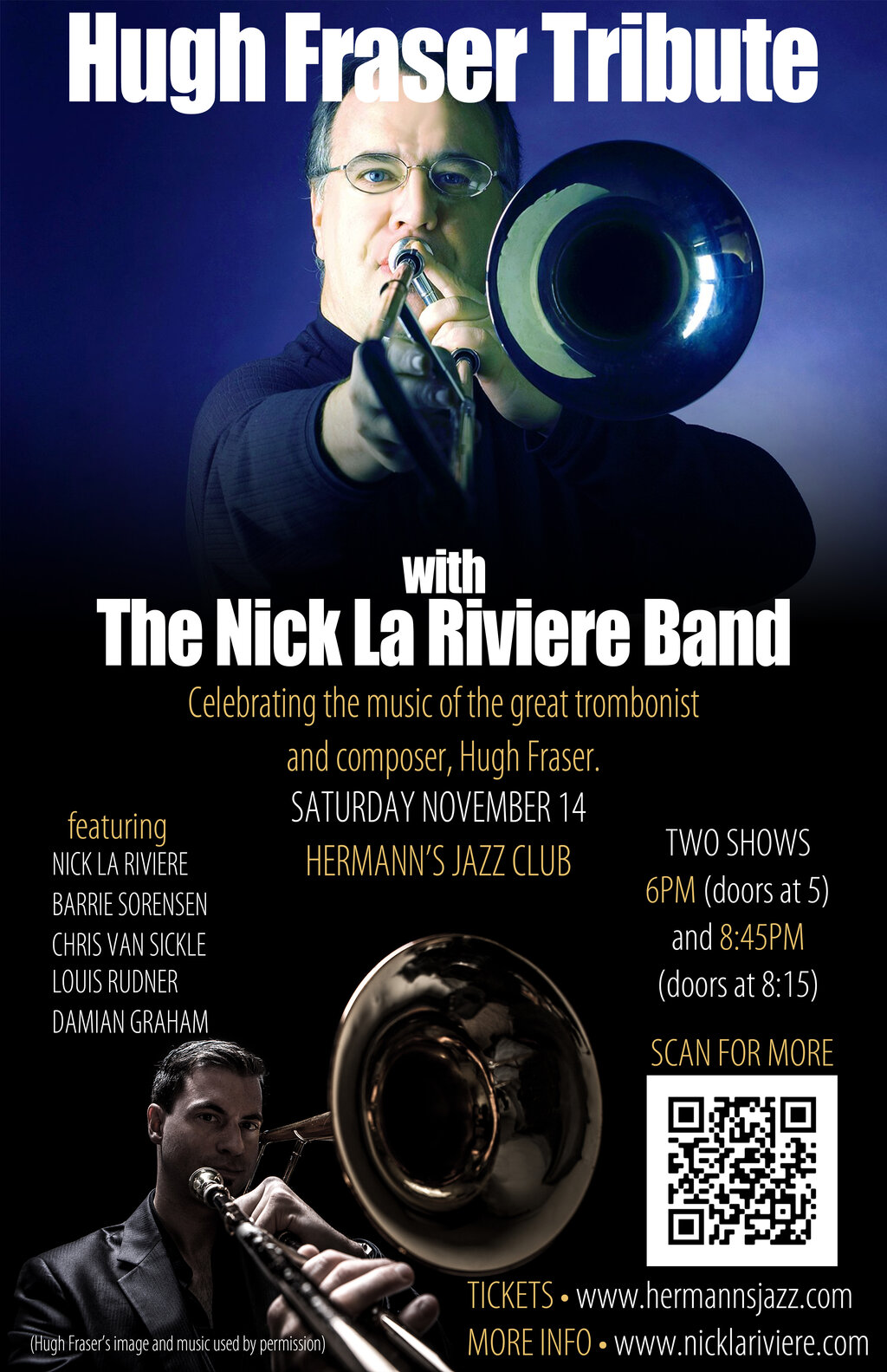 The Nick La Riviere Band will be performing two full shows (an early and late seating) of Hugh’s compositions. I’ll be doing my best to recreate Hugh’s fantastic energy and approach to performance. This will be a very different performance from the usual ‘Nick La Riviere Band’ shows that feature my originals and more vocal/R&B/funk type tunes, but it will be a great and entertaining show nonetheless.