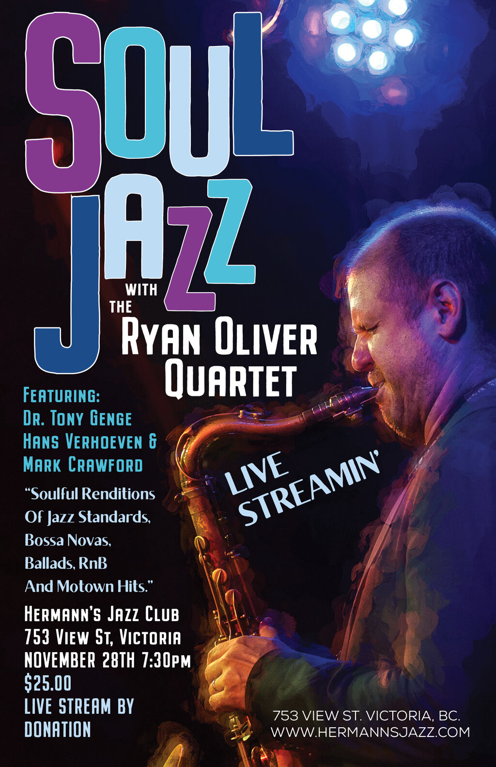 Tough toned, Juno-nominated saxophonist Ryan Oliver honed his craft living on Canada’s west coast, and in Amsterdam, Toronto and New York and has performed throughout the world with his own groups as well as touring with The Shuffle Demons for the last 15 years. His stellar quartet will be performing a night of Soul Jazz featuring Hans Verhoeven on drums, Tony Genge on organ, and Mark Crawford on the guitar.
