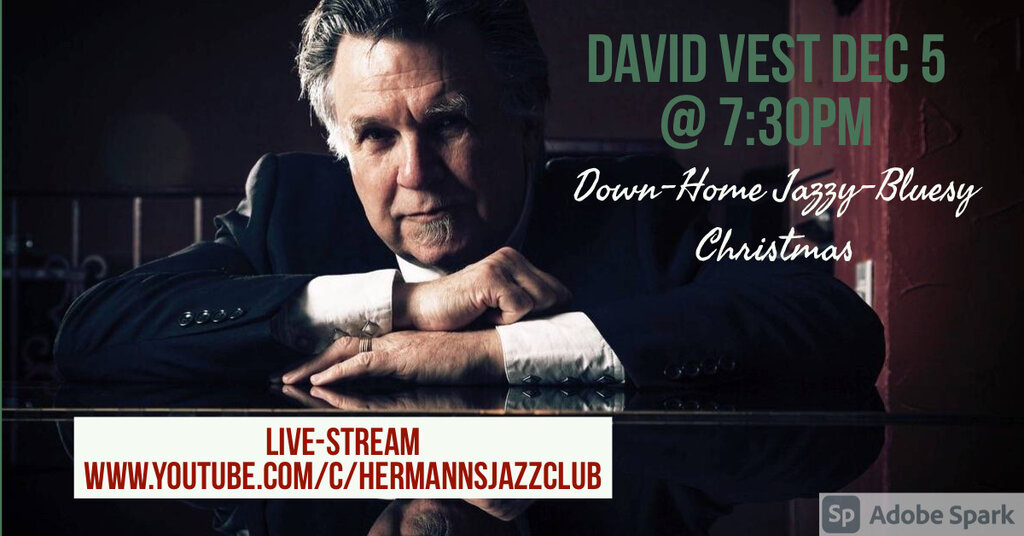 7:30pm - 9:00pm doors at 6:30pmLet David Vest and his top-notch band get you in the holiday spirit with a fresh take on the classics and even some brand new songs by David to celebrate the season. Whatever the weather outside, you know it’ll be cool and hip at Hermann’s Jazz Club. This is not the stuff you’ll be hearing in the department stores. Expect some boogie beats and some deep blue grooves from down along the Gulf Coast, as David and the band get right to the heart of things. Nothing but the best, and later for the rest.