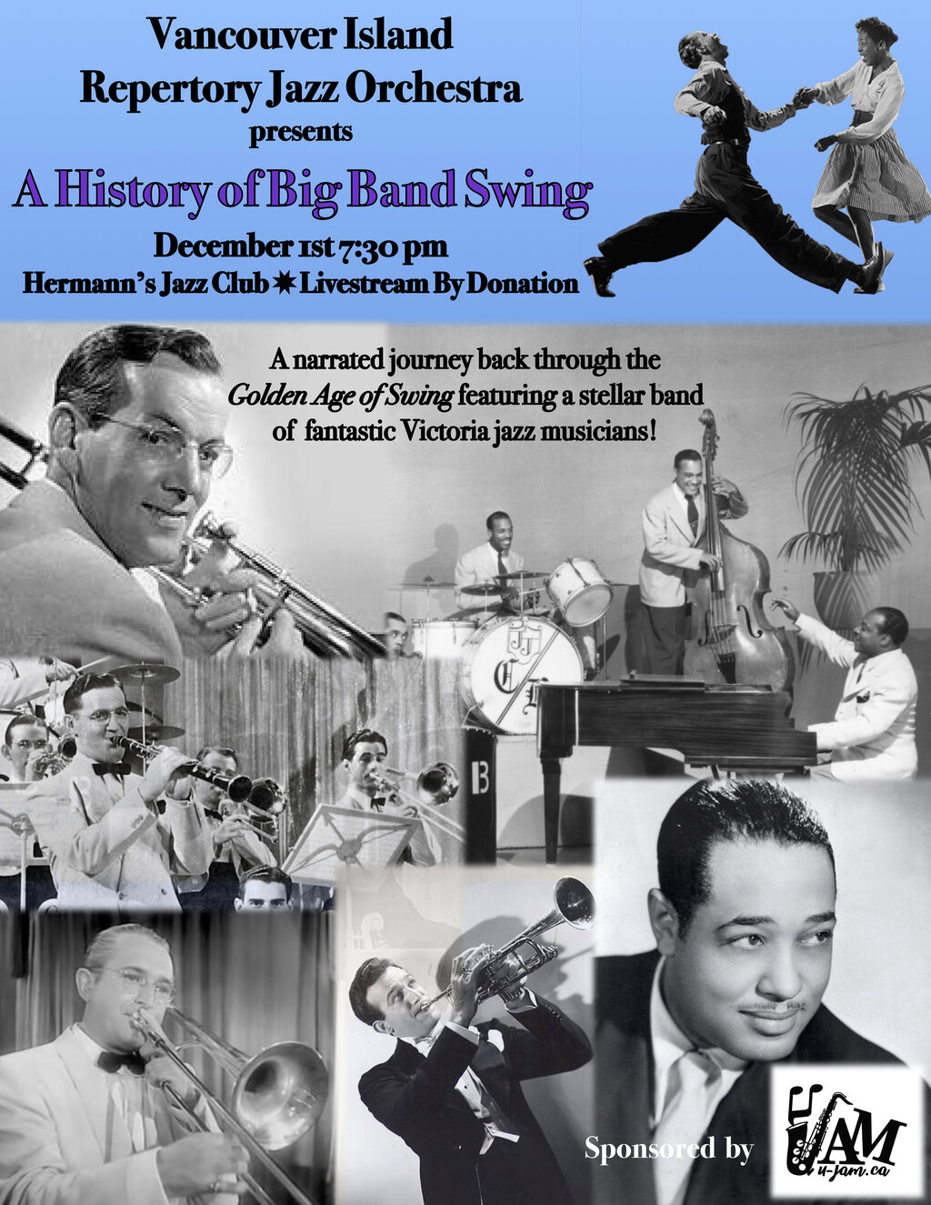 The UJAM (Universal Jazz Advocates and Mentors) Society is proud to sponsor and present the Vancouver Island Repertory Jazz Orchestra's: “A History of Big Band Swing”. In a narrated performance of the beginnings of swing through to the Golden Age, the band will highlight the music of Henderson, Moten, Ellington, Basie, Dorsey, James, Miller, Shaw, Barnet & Goodman. If you do OR don’t recognize these names you NEED to check out this show!!!