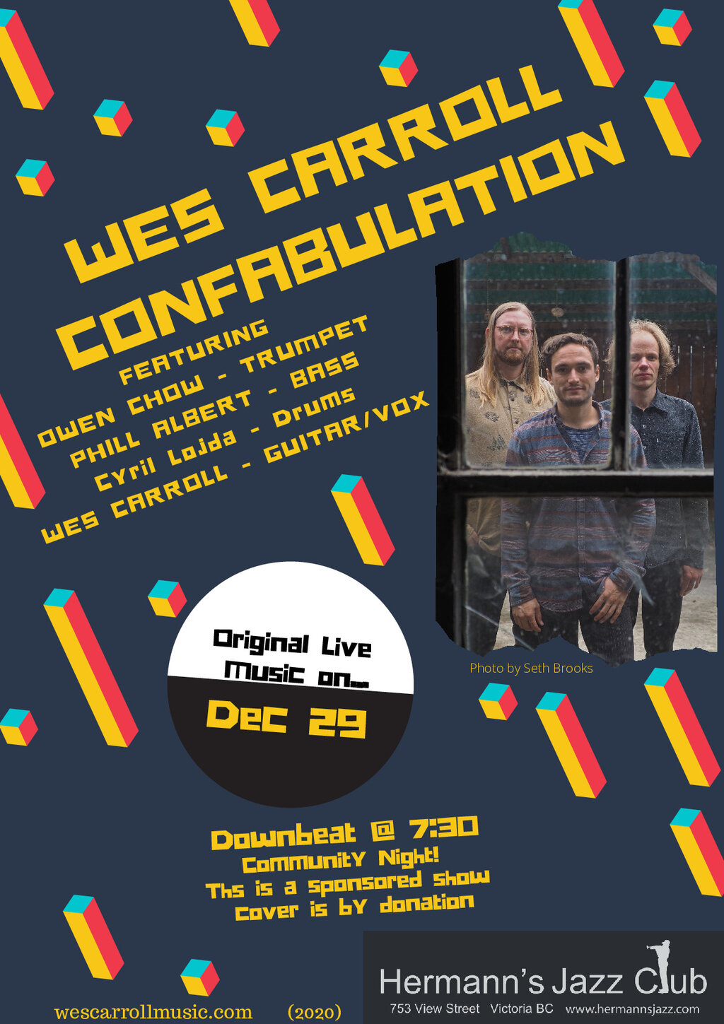 Guitarist, vocalist and songwriter Wes Carroll honed his craft at Vancouver Island University’s jazz studies program (2014) and is currently doing a masters in jazz performance at the University of Toronto. He walks a virtual tight-rope delicately balancing detailed arrangements with the power of spontaneity. He creates topical songs about important issues like social justice, surveillance, mental health, climate change and even a few love songs. Since early 2015, the group has enhanced and perfected their unique blend: stretching out into a world of hip-hop grooves, soul and electricity while not losing their jazz footing. They are currently promoting their second studio album, “Elephant in the Sea” (2020).