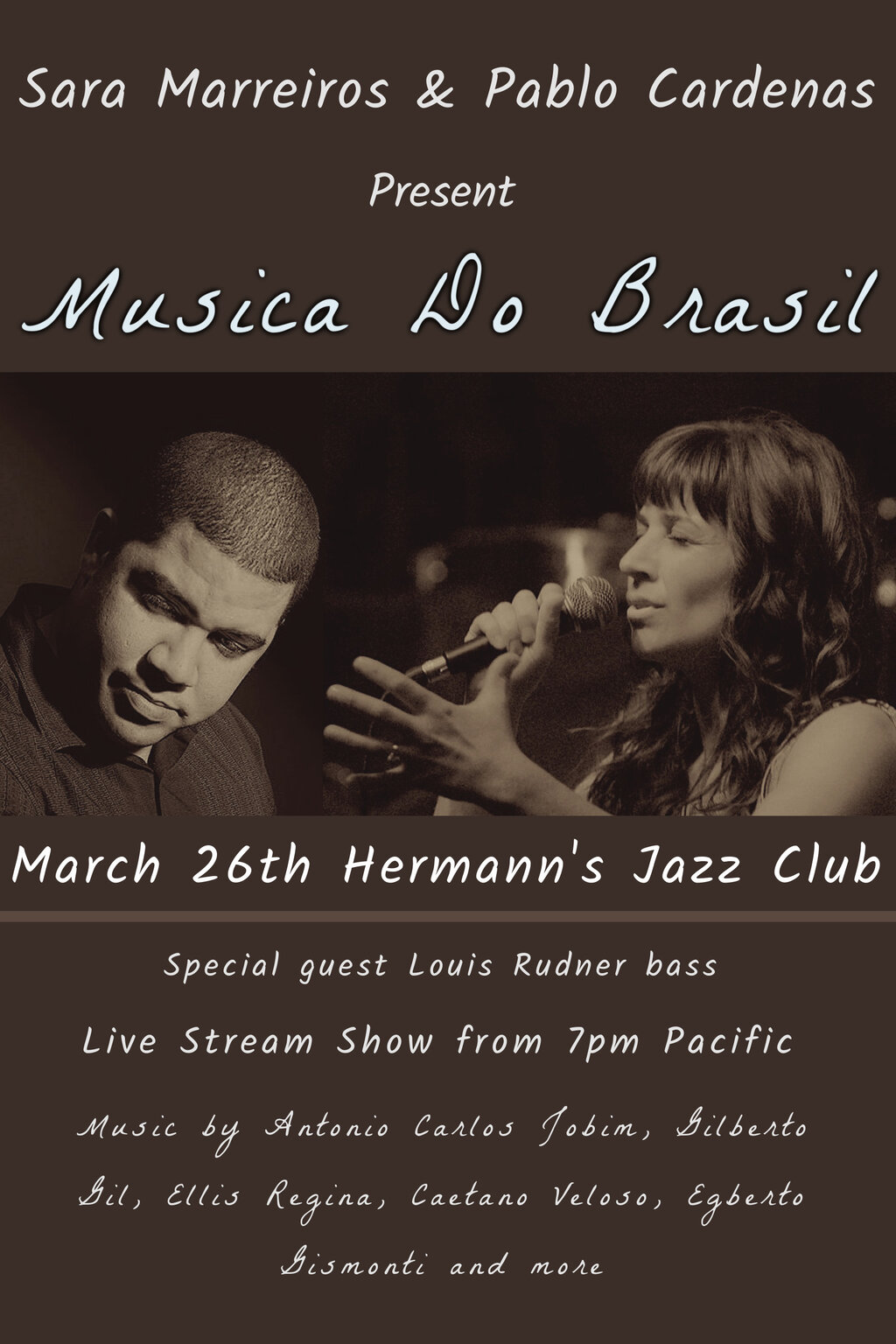 Cuban pianist Pablo Cardenas and Canadian-Portuguese singer Sara Marreiros are back at Hermann’s Jazz Club to perform music from Brazilian composers. Sara is a world class singer and artist, with an incredible musicality and unique style of singing. This is a special opportunity to not miss these two artists collaborating once again. This show will also feature their special guest, the amazing Louis Rudner on bass.