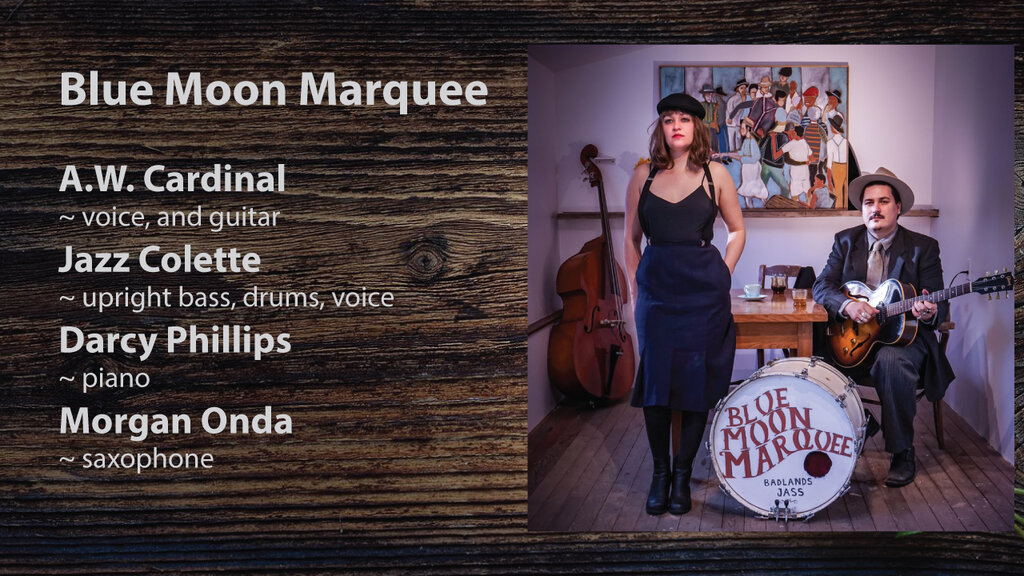 Blue Moon Marquee is a Gypsy Blues band born of the wild rose country. A.W. Cardinal (vocals/guitar) and Jasmine Colette a.k.a. Badlands Jass (vocals/bass/drums) write and perform original compositions influenced by anything that swings, jumps or grooves. Join us for a wonderful night!