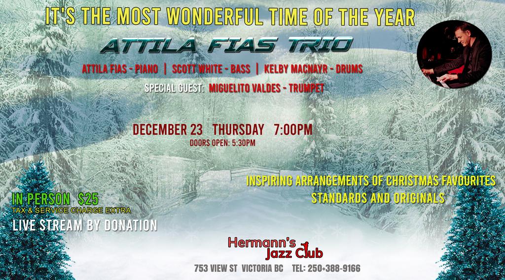7:00 - 9:00 doors at 5:30Pianist/composer Attila Fias and his fantastic trio will be creating some holiday cheer to get you into the spirit with their electrifying and intoxicating renditions of Christmas tunes, jazz standards and originals. Things will alternate between festive and lively to warm and cozy!