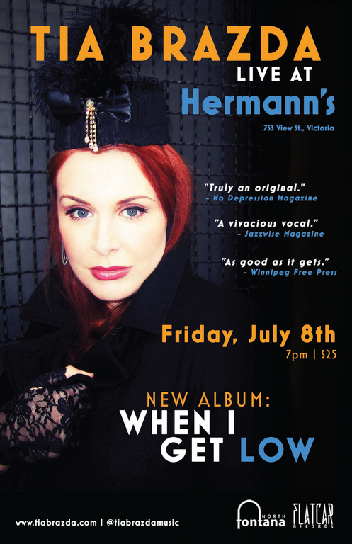 One of Canada’s most recognizable voices in jazz, Tia Brazda’s speakeasy style and original songwriting pay homage to the golden era while remaining daringly modern. Since her debut release, “Cabin Fever” in 2012, she has played jazz festivals across North America and Europe, including the Montreux Jazz Festival and Festival International de Jazz de Montreal. Brazda’s sound has been described as “a hip pastiche”, while Craig Charles of BBC Radio named her song “Hard Luck” as one of best of 2016. Her album, “Bandshell” was named as one of the best of the past decade by Rai Radio in Italy and best of the year by Jazz FM91 in Canada. Currently touring her new album, “When I Get Low”, Brazda waxes nostalgic with sultry interpretations of beloved songbook standards.