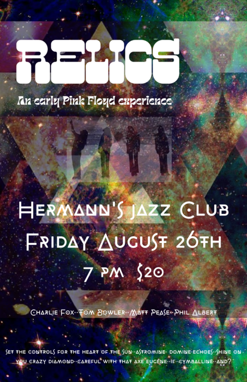 Imagine walking into a bar in the early 70's, and Pink Floyd is in the corner playing their iconic Rock music...That is the vibe that "Relics" will be presenting at their show at Hermann's Jazz Club (downstairs) on Friday August 26th at 7pm.