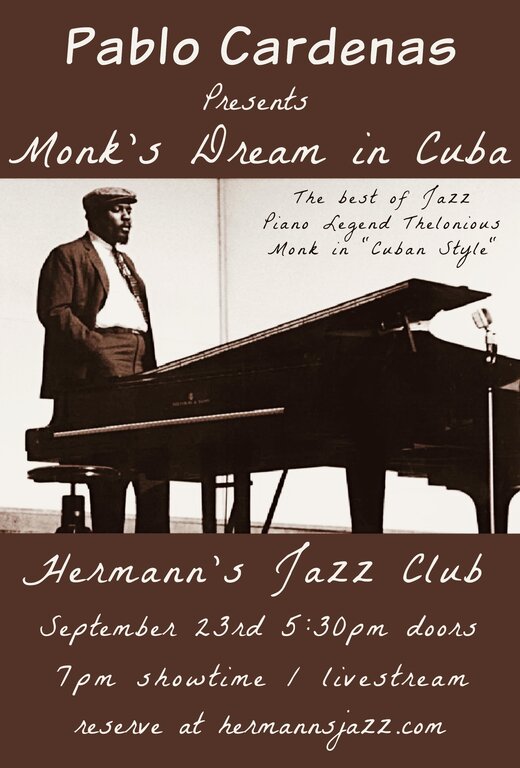 7:00 - 9:30 doors at 5:30World class Cuban pianist Pablo Cardenas is back with a tribute to Thelonious Monk, one of the best Jazz composers of all times. He will play Monk’s best hits “the Cuban way”, using Cuban rhythms, and adapting the melodies to this new concept. An stellar line up and special guests will be joining him on a musical experiment to not miss.