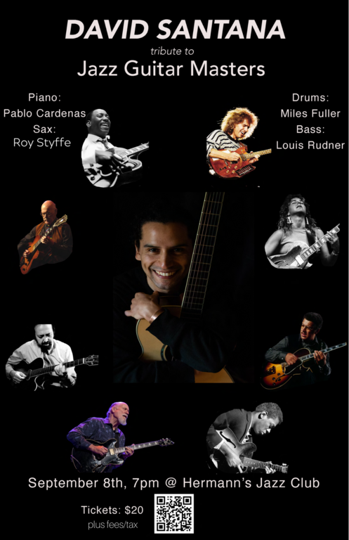 7:00 - 9:00 doors at 5:30Come experience rising star, jazz guitarist, David Santana and his all star band as they pay tribute to the most influential jazz guitarists in history. Get ready to groove to the sophisticated sounds of the six string masters like Wes Montgomery, Barney Kessel, John Scofield, Pat Metheny and many more!