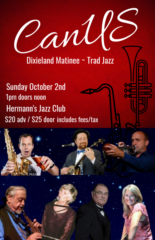 1:00 - 3:00 doors at 12:00Amazingly, this is 30 years of performing at Hermann’s Jazz Club while at the same time touring the U.S. and Canada Traditional Jazz Festivals. The musicians may vary over time but the music remains true to our style. Alfons Fear is on trumpet Al Pease, reeds, Simon Stribling, trombone, Avram McCagherty banjo, Lauri Lyster , drums, Joey Smith bass, leader and tickling the ivories in her ragtime-y style is Toni Blodgett. And we sing! Make a date and celebrate this special musical event in a world class show room with restaurant service! CanUS offers traditional New Orleans Jazz and early swing era standards played by musicians who know how to get those feet tapping and lift your spirits in tough times with lots of room for you to bring friends as well. 'Happy jazz' is something we can all enjoy together.