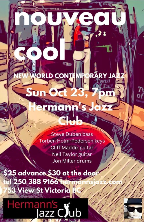 7:00 - 9:00 doors at 5:30The Nouveau Cool is a Victoria BC based jazz fusion band formed in 2019 and led by bassist Steve Duben. Featuring two outstanding guitarists Cliff Maddix and Neil Taylor paired with a driving rhythm section, this quartet plays an eclectic mix of material by contemporary artists including the Fearless Flyers and the Steve Gadd Band along with original compositions by group members. Touching on funk, blues, rock, and latin, the Nouveau Cool offers a contemporary take on jazz for the Vancouver Island music scene.