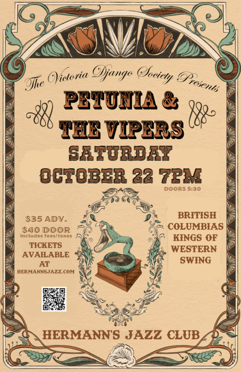 7:00 - 9:30 doors at 5:30After touring for the past decade to the UK, Canada and parts of the USA, world acclaimed five piece Western Swing group Petunia and the Vipers make another trip to Victoria for Hermann's Hot Club. Louis Armstrong was once asked what his favorite kind of music was, and his response was simple; “Good music”. Petunia & the Vipers’ sound may not sit comfortably in one certain genre, but “Good Music” describes it well. Together with his band the Vipers they play original music combining elements of classic 1920’s, 30’s 40’s, 50’s, 60’s, and 70’s country, western swing, French cabaret, Romanian, ragtime, jazz, country blues, alt country rock, Mexicana, punk and folk music’s. A new music that springboards off of music of the past and jumps into the present day, left with only echoes of the past… Something in between 1920’s and steam punk.