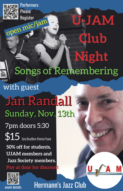 Our special guest and host will be pianist, composer Jan Randall along with the U-JAM Club Night Band.