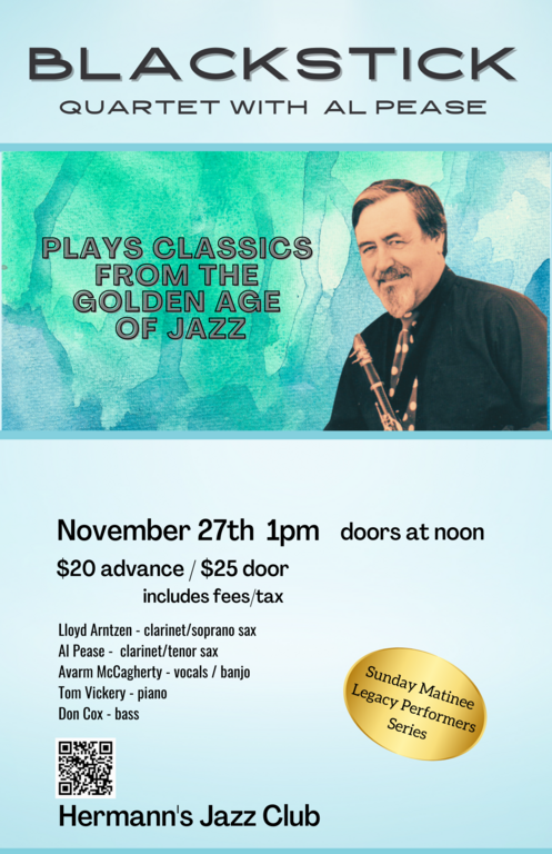 1:00 - 3:00 doors at 12:00BLACKSTICK, featuring Al Pease on Clarinet and sax, with Don Cox on bass, Avarm McCagherty on banjo/vocals, Tom Vickery on piano, for a very special event. Blackstick presents the Classics from the Golden Age of Jazz - including music from greats such as Louis Armstrong and Sidney Bechet.
