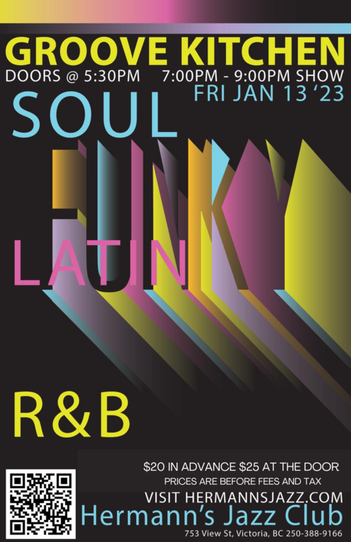 Time to live in the moment... with us at Hermann's Jazz Club and get that FUNKY FRIDAY feeling!! Let GROOVE KITCHEN soulfully solidify your spot in the new year with songs that boogie big, funk fresh, Latin lovingly, and pop pop to make you dance 'til you drop. These master chefs have brought bounce to Butcharts, the jam to Victoria's International Jazzfest, sizzled up the summer park series, and rocked all the best rooms/events around town. Start your weekend off right with a proper party night!!