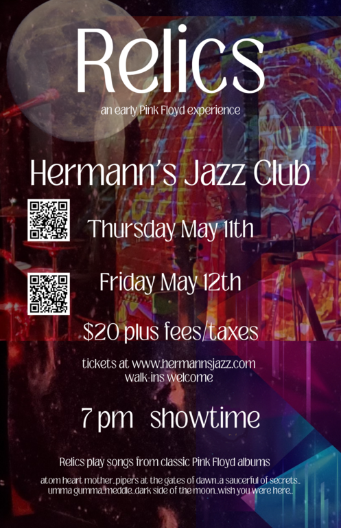 Imagine walking into a bar in the early 70's, and Pink Floyd is in the corner playing their iconic Rock music...That is the vibe that "Relics" will be presenting at their show at Hermann's Jazz Club (downstairs) on Thursday May 11th at 7pm.