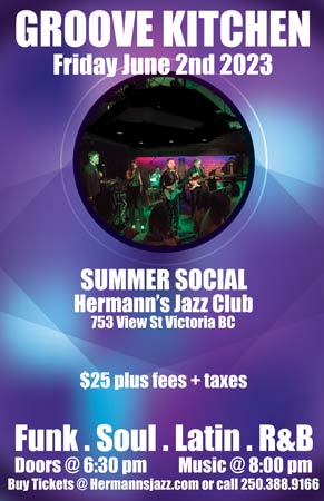8:00 PM - 11:30 PM doors at 6:30 PMSummer… Sun… Fun!!! No more excuses now… time to get together and get down with those party pioneers, Groove Kitchen!!! We will fling the funk, slang the soul, lift the Latin, and produce the pop just like we have before at the Victoria International Jazzfest, the Butchart Gardens, the Moss Street Paint In, and all the hot rooms in town to make you dance in celebration of the season. Call your peeps and let’s Boogie!!!