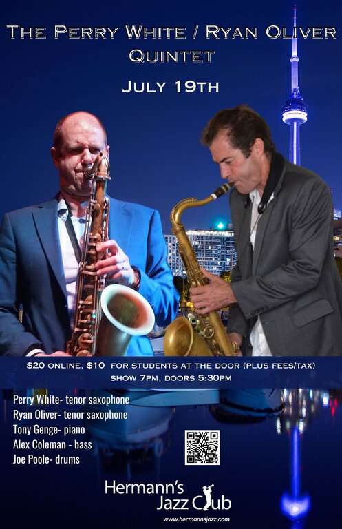 After working together for over 15 years in the Shuffle Demons, Ryan Oliver and Juno Award winner Toronto-based saxophonist Perry White reunite for what is sure to be an incredible evening of music. Juno award winning Vanocouver-based drummer Joe Poole will be featured in the rhythm section alongside the ever-swinging combo of Tony Genge and Alex Coleman.