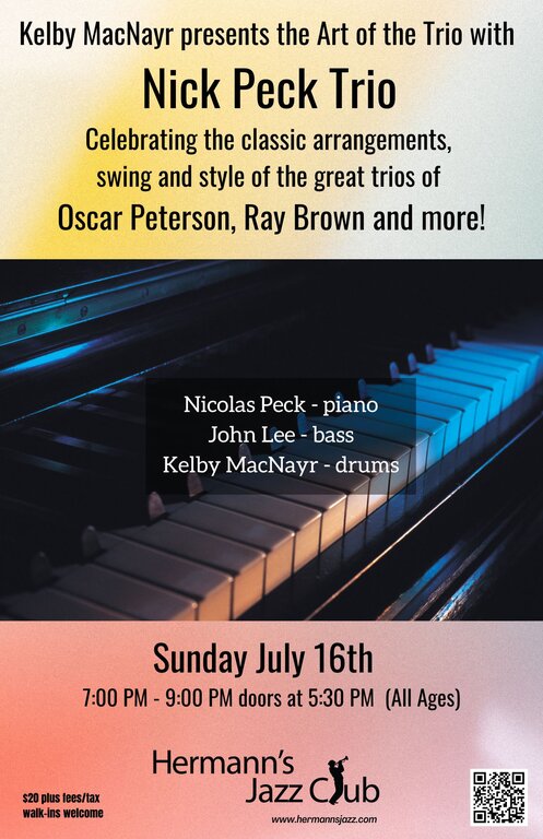 7:00 PM - 9:00 PM doors at 5:30 PMFeaturing renowned British pianist Nicolas Peck, bassist John Lee and acclaimed Drummer Kelby MacNayr, the trio will celebrate some of the classic arrangements, Swing and style of the great trios of Oscar Peterson, Ray Brown and more!