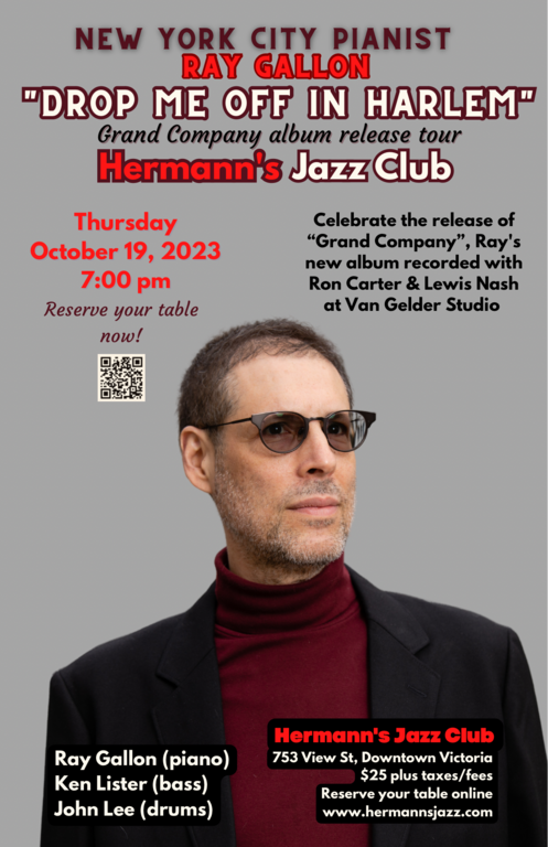 7:00 PM - 9:00 PM doors at 5:30 PMCelebrate the rich musical legacy of Harlem with renowned NYC pianist Ray Gallon in support of the release his new trio album with legendary bassist Ron Carter and drum master Lewis Nash, “Grand Company”, available November 17 on Cellar Music. “Drop Me Off in Harlem”, the opening track on the album, is Ray’s arrangement of this classic Duke Ellington song, composed in 1933 during the Harlem Renaissance, soon after Ellington concluded his long residency as musical director of the famed Cotton Club. He will appear in Victoria with bass virtuoso Ken Lister, and multi-instrumental sensation John Lee on drums.