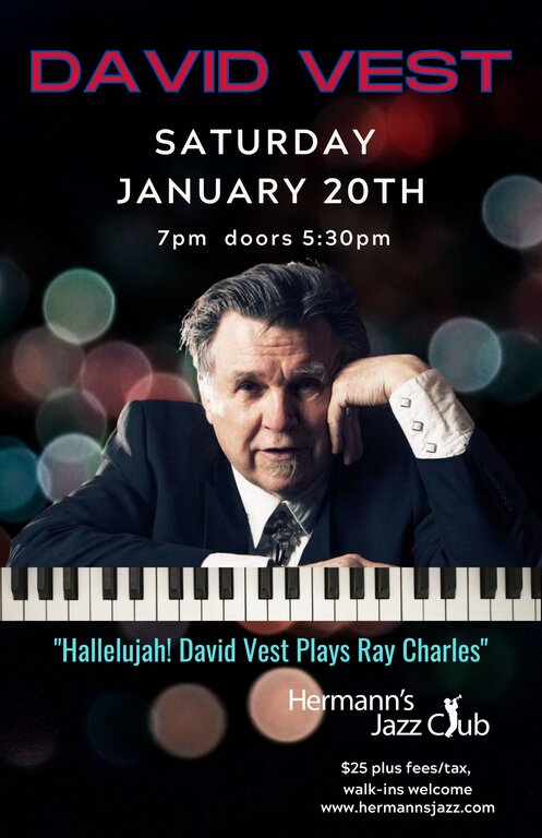 7:00 PM - 9:00 PM doors at 5:30 PMFor the first time in years, David Vest and his band revisit one of their all-time most popular themes: the music of the great Ray Charles, who of course recorded jazz albums as well as rock, soul, and pop hits. Perhaps more than any other artist of his time, Ray succeeded in bringing elements of gospel music into popular music. You'll hear the classic favourites as well as lesser-known tunes that illustrate why Ray Charles was such a great piano player.