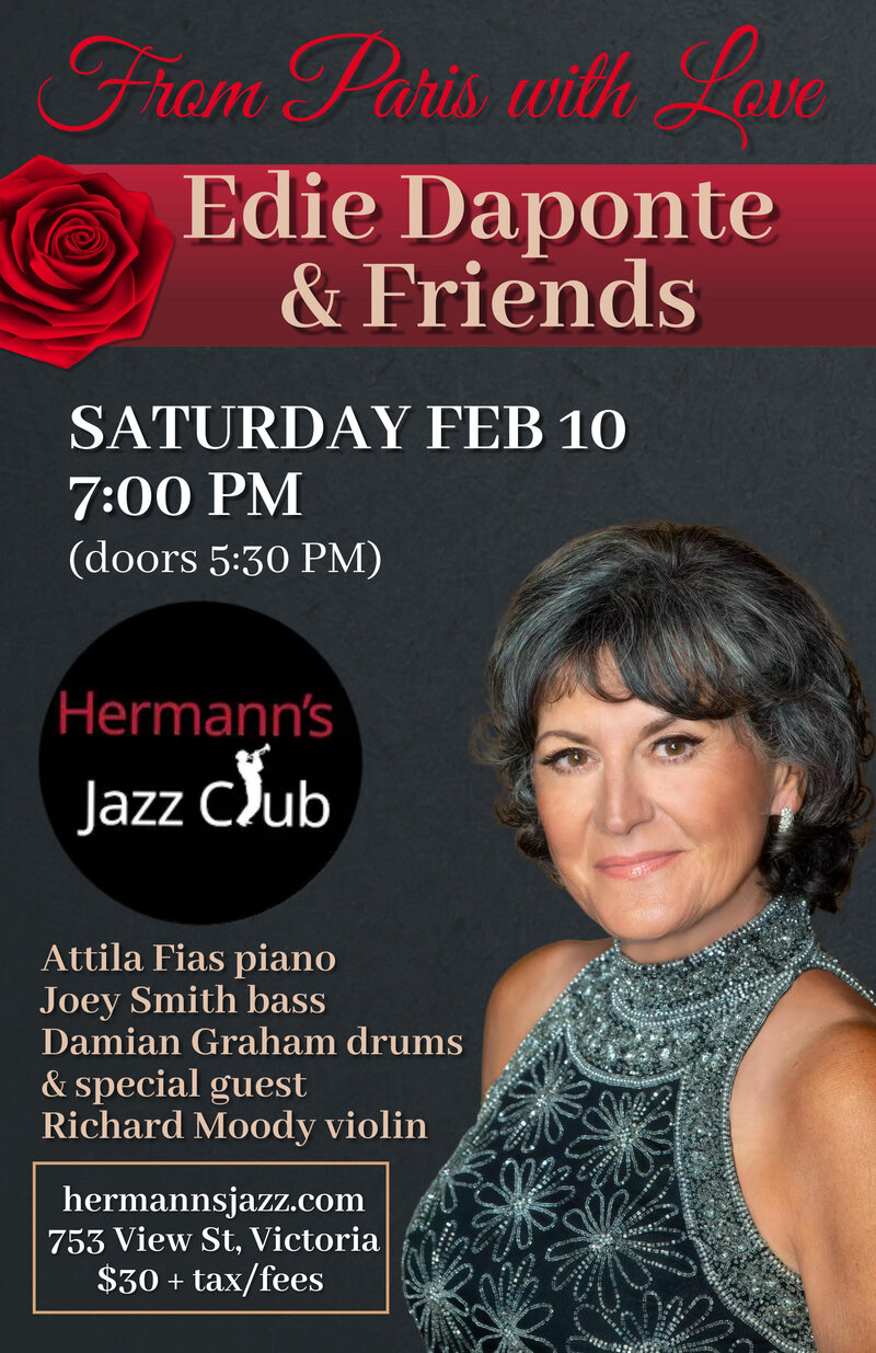 7:00 PM - 9:00 PM doors at 5:30 PMFollowing a sold out show in November, join celebrated singer Edie Daponte with special guest Richard Moody on violin, Attila Fias piano, Joey Smith bass and Damian Graham drums.