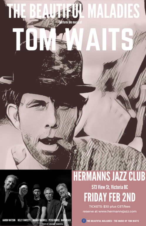 7:00 PM - 9:00 PM doors at 5:30 PMThe Beautiful Maladies have been bringing the music of Tom Waits to live audiences since 2015. With continual sold-out shows at Hermann’s Jazz Club, the band is now touring Vancouver Island, with eyes on the mainland.